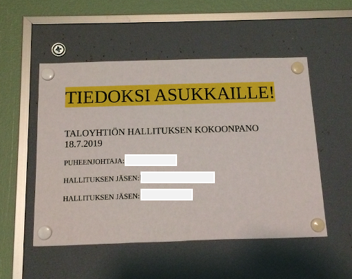 18.7.2019 Yhtiö tiedotti uuden, vajaalukuisen, hallituksen kokoonpanon ASUKKAILLE rappukäytävän ilmoitustaululla. Yhtiön käytännön mukaan mitään ilmoitusta ei tehty PRH:lle, eikä vaivauduttu informoimaan asiaa yhtiön omistajille, osakkaille, lainkaan. Tässä vaiheessa siis silloinen puheenjohtaja myi osakkeensa ja yksi rivijäsenistä erosi hallituksesta… jäljelle jääneistä yksi jäsen ei asunut yhtiössä, huoneisto oli vuokralla (tämä on ihan oma sivujuoni, mutta jääköön se kertomatta…).