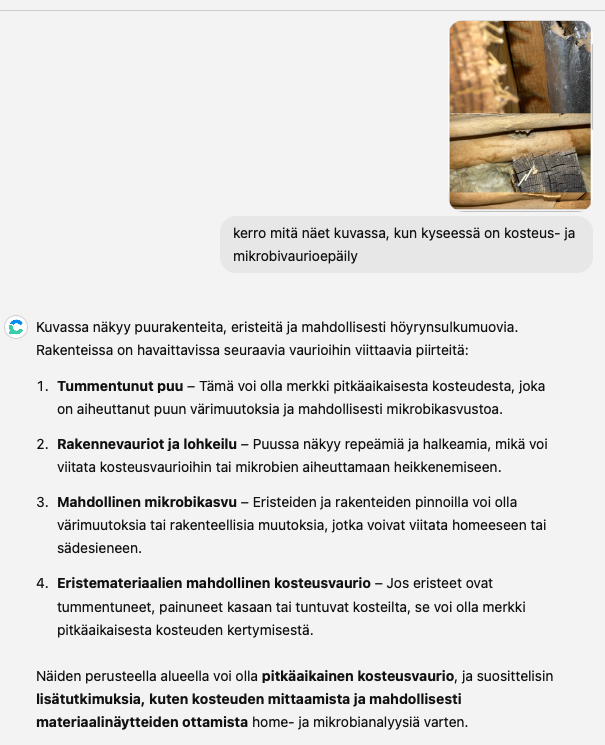 Kysymys, minkä tein: kerro mitä näet kuvassa, kun kyseessä on kosteus- ja mikrobivaurioepäily