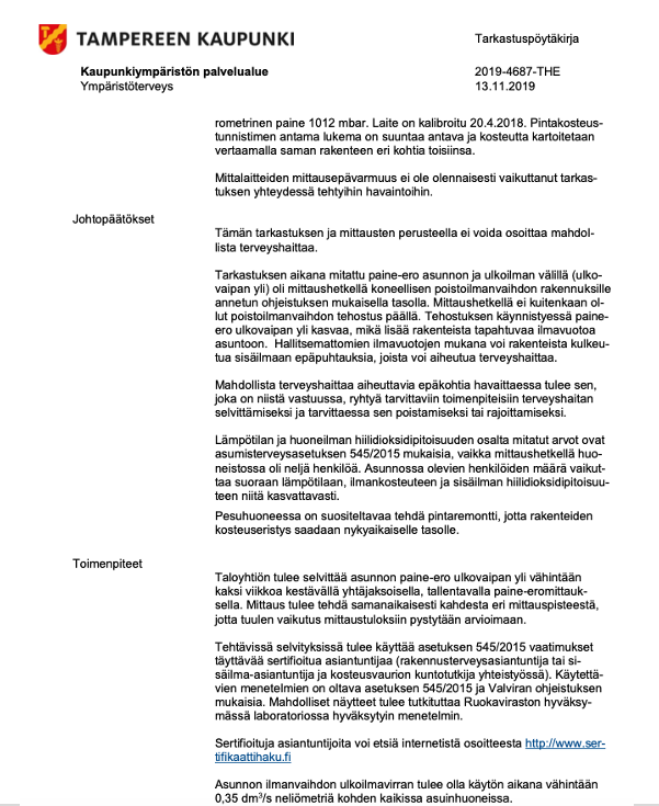 ”Tarkastuksen aikana mitattu paine-ero asunnon ja ulkoilman välillä (ulkovaipan yli) oli mittaushetkellä koneellisen poistoilmanvaihdon rakennuksille annetun ohjeistuksen mukaisella tasolla. Mittaushetkellä ei kuitenkaan ollut poistoilmanvaihdon tehostus päällä. Tehostuksen käynnistyessä paineero ulkovaipan yli kasvaa, mikä lisää rakenteista tapahtuvaa ilmavuotoa asuntoon. Hallitsemattomien ilmavuotojen mukana voi rakenteista kulkeutua sisäilmaan epäpuhtauksia, joista voi aiheutua terveyshaittaa.”